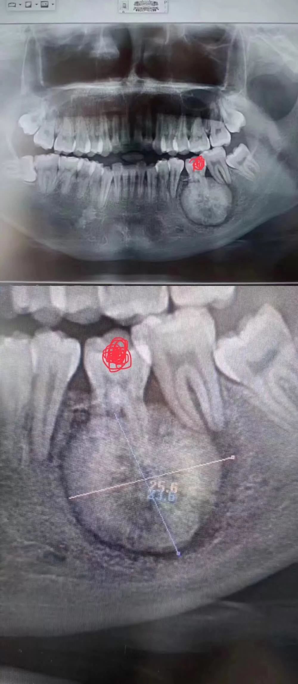 原來患者係一個好年輕嘅男仔30圖度紅色標記嘅牙鬆動,佢要求拔牙,開始。懷疑嫌麻煩,之後經過再三勸說仲係拍咗片。結果令所有人包括佢自己都驚呆咗。估計係良性嘅,具體就要去醫院住院手術做病理檢查先知。